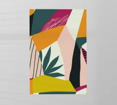 Un collage astratto di forme frantumate e sovrapposte in una vibrante tavolozza di arancione, blu e rosa crea una composizione dinamica, energica e moderna.