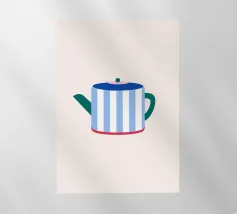 È esposta una collezione di sei estrose teiere, ciascuna decorata con motivi floreali e di frutta unici. I disegni presentano forme e colori diversi, creando un tema giocoso e affascinante.