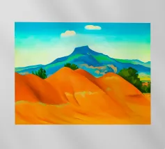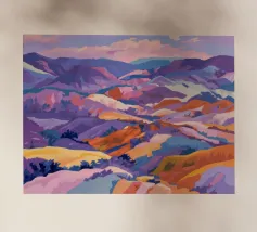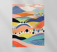 Morbide colline ondulate mostrano ricche sfumature di rosa, arancione e blu, mentre un cielo vibrante pieno di soffici nuvole esalta l'atmosfera tranquilla. Piccoli alberi punteggiano il paesaggio.