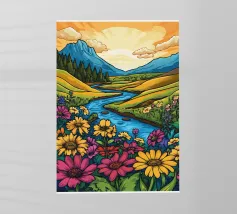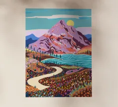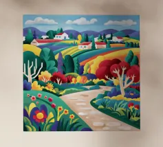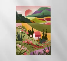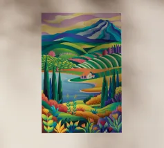 Un paesaggio panoramico delle dolci colline toscane, con strade tortuose, cipressi e campi resi con una tavolozza di colori ricchi e caldi che cattura la bellezza della campagna italiana.