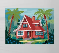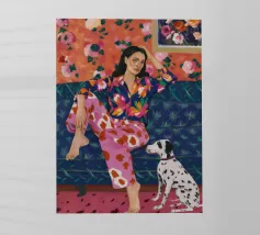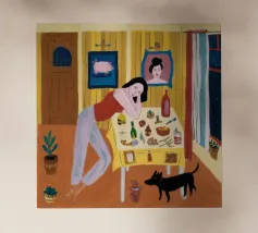 Una donna si trova in una cucina dai colori vivaci con un dalmata al suo fianco, una finestra che mostra una scena all'aperto e vari dettagli della cucina, creando un'illustrazione domestica eccentrica e affascinante.