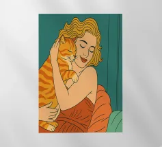 Un'illustrazione semplice e commovente di un piccolo gatto arancione felicemente appollaiato sulla spalla di una persona. La composizione minimalista su uno sfondo blu solido si concentra interamente sul legame affascinante e affettuoso tra una persona e il suo animale domestico.