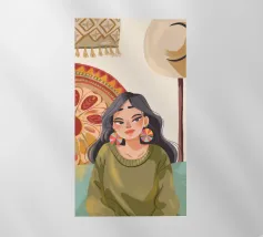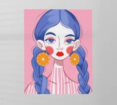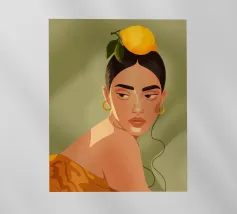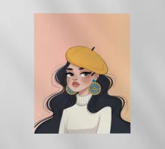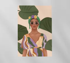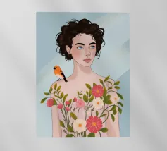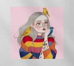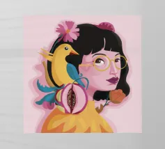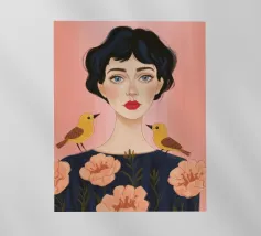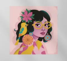 Questo dipinto ritrae una persona che indossa una camicia a righe gialle e bianche con grandi orecchini arancioni. Un piccolo uccello è appollaiato sulla spalla della persona, aggiungendo un elemento affascinante alla composizione.