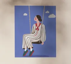 Questo dipinto ritrae una persona che indossa una camicia a righe gialle e bianche con grandi orecchini arancioni. Un piccolo uccello è appollaiato sulla spalla della persona, aggiungendo un elemento affascinante alla composizione.