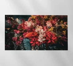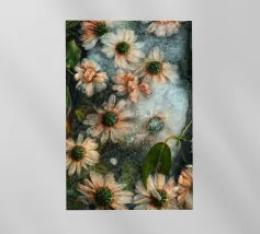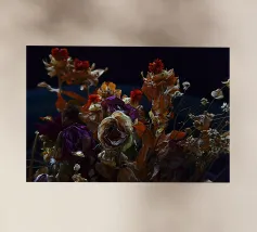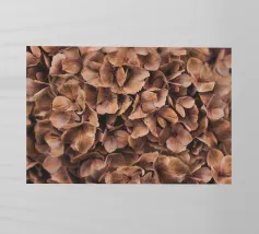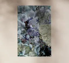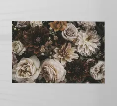 Quest'opera d'arte presenta una composizione di piante secche ed elementi floreali disposti ad arte che combinano naturalezza ed estetica. Tre fiori bianchi sono al centro della scena, la loro forma elegante e la loro consistenza fine ricordano la porcellana. Appaiono come protagonisti silenziosi in un ricco insieme di materiali essiccati, tra cui foglie delicate, teste di semi e capsule di frutta nelle calde tonalità del marrone, del verde e del blu.