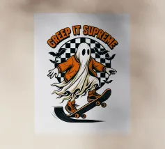 Una patatina fritta vampiresca a forma di cartone animato si erge minacciosa, con un mantello che si allunga, circondata da pacchetti di ketchup spaventati e da un'inquietante foresta notturna.