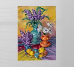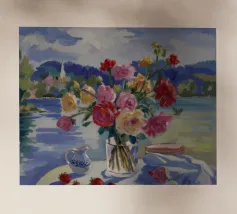 Un'audace natura morta con vivaci fiori rosso-rosa, forse papaveri o gerani, in un semplice vaso, accanto a fresche pere verdi, il tutto su una ricca tovaglia rossa che contrasta nettamente con uno sfondo blu intenso.