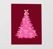 Un'affascinante illustrazione di un albero di Natale rosa ornato da graziosi fiocchi, perfetto per gli amanti delle civette e per gli appassionati di decorazioni vintage.