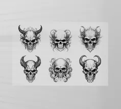 Diversi teschi sono appesi in una ragnatela di ragnatele e rami spinosi. La scena è in bianco e nero e appare oscura e misteriosa per la ricchezza dei dettagli. Un motivo a metà tra l'incubo e l'opera d'arte.