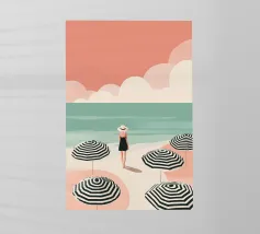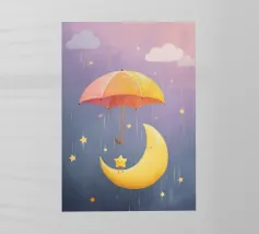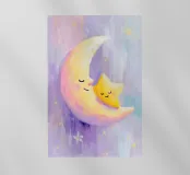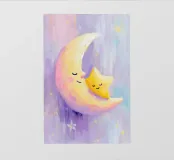 Una luna dipinta a mano a guazzo abbraccia una piccola stella, entrambe sorridono dolcemente. I toni pastello e le texture delicate creano una cameretta sognante e rilassante con uno sfondo pulito e pastello.