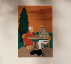 Un'illustrazione intima che cattura un momento di tranquillità tra due persone sedute a un tavolino di un bar. L'illuminazione calda e tenue e la loro interazione concentrata creano un racconto di conversazione e connessione, rappresentativo della vita sociale moderna.