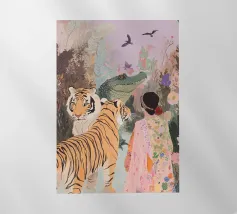 Un duetto stravagante: una donna con un abito a pois balla con una tigre serena sotto un giardino illuminato dalla luna. Moderna e retrò, la scena fonde forza e morbidezza.