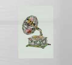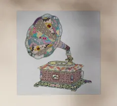 Una nostalgica stampa d'arte a collage che unisce fascino vintage e romanticismo. Un grammofono ornato esplode di fiori vivaci e dischi in vinile, mentre una coppia che balla cattura la magia della musica senza tempo. Un'opera d'arte da parete perfetta per gli amanti della musica, per gli appassionati di arredamento retrò o per chiunque sia attratto dalla narrazione di storie sentimentali attraverso il design.