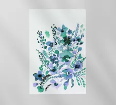 Quest'opera d'arte presenta una delicata disposizione di forme floreali astratte, dipinte con acquerello indaco. I fiori appaiono sparsi lungo una sottile e sinuosa liana che attraversa verticalmente la composizione. I petali variano nella tonalità di colore, da un tenue slavato a un blu intenso, creando un senso di movimento e di ritmo organico sullo sfondo neutro.