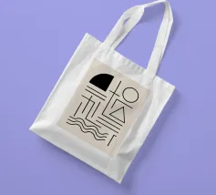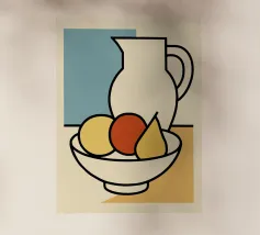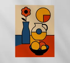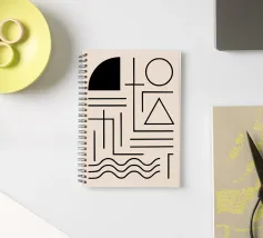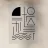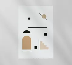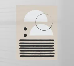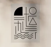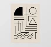 Una disposizione astratta di forme geometriche su sfondo beige, con semicerchi, linee e triangoli. Il design è semplice ma audace, con contorni neri che creano un contrasto sorprendente.