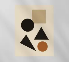 Una disposizione astratta di forme geometriche su sfondo beige, con semicerchi, linee e triangoli. Il design è semplice ma audace, con contorni neri che creano un contrasto sorprendente.