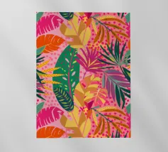 Un motivo vibrante e diffuso di foglie tropicali stilizzate nei toni del giallo, del rosa, del verde acqua e del verde, che crea un'esposizione botanica rigogliosa ed energica.
