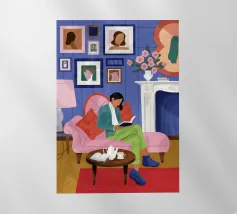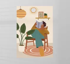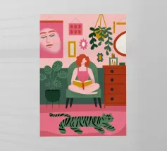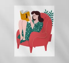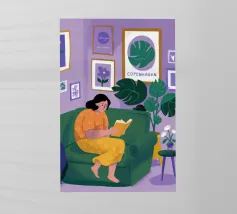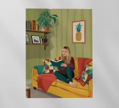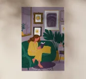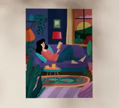 Una donna si accoccola su un divano verde, immersa in un libro e con una tazza di tè vicino. La stanza è decorata con piante e opere d'arte, creando una scena perfetta di confortevole solitudine e fuga intellettuale.