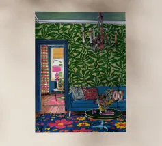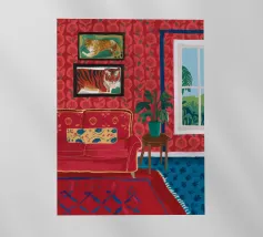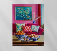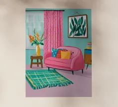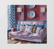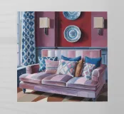 Un lussuoso divano di velluto rosa si trova tra due tavolini con lampade, in una stanza con pareti rosso intenso e tende blu a fantasia. La scena è equilibrata, serena ed emana un'eleganza sofisticata e lunatica.