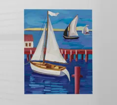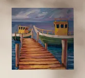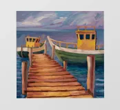 Un molo di legno si estende in un porto tranquillo dove le barche gialle riposano sotto un cielo sereno.