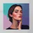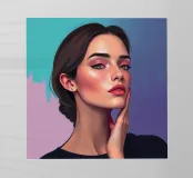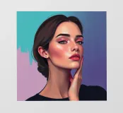 Una donna posa con la mano sul mento, mostrando uno sguardo sicuro. Il trucco è vivace e lo sfondo è caratterizzato da motivi astratti colorati e audaci, che creano un'immagine di grande impatto.