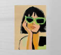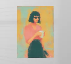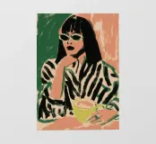 Illustrazione stilizzata di una donna con lunghi capelli scuri e occhiali da sole tondi che tiene in mano una tazza verde. Strisce diagonali bianche e nere sulla parte superiore, giacca verde chiaro, sfondo color pastello con pennellate verdi. Stile minimalista e grafico con forme chiare e colori decisi.