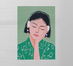 Illustrazione stilizzata di una donna con lunghi capelli scuri e occhiali da sole tondi che tiene in mano una tazza verde. Strisce diagonali bianche e nere sulla parte superiore, giacca verde chiaro, sfondo color pastello con pennellate verdi. Stile minimalista e grafico con forme chiare e colori decisi.