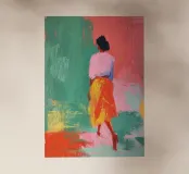 Dipinto a olio di una donna in gonna e camicia bianca, vista da dietro. Rosa pastello, verde acquamarina e arancione brillante, pennellate decise, sfondo minimalista. Stilisticamente ricorda Matisse e gli anni '50, moderno, elegante ed espressivo.