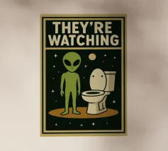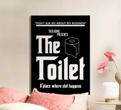 Il testo bianco in grassetto su sfondo nero presenta in modo umoristico un messaggio relativo alla toilette, con una rappresentazione giocosa di un rotolo di carta igienica. La frase "Don't ask me about my business" aggiunge un tono comico al design.