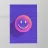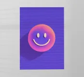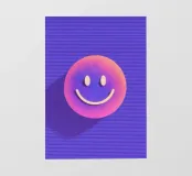 Illustrazione digitale minimalista di una faccina astratta su sfondo viola. Tavolozza di colori retrò, circolare, con effetto glitch, bagliore al neon, ombre sottili e texture. L'elevato contrasto e i colori vivaci creano una composizione accattivante, moderna ed elegante.
