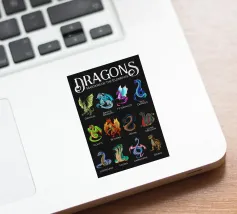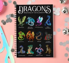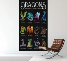 Questa impressionante grafica mostra dodici diverse specie di drago in illustrazioni colorate, ognuna con il proprio nome. Da creature classiche come il "Wyvern" o il "Lindwurm" a creature esotiche come il "Feydragon" o l'"Amphitere", ogni esemplare è unico per colore, forma e carattere. Le maestose creature sono disposte su uno sfondo scuro con la scritta bianca "Dragons - Masters of the Elements" (Draghi - Maestri degli Elementi), che sottolinea il tema soprannaturale.