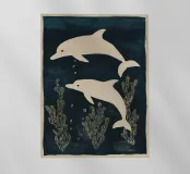 Due delfini che nuotano in acque blu profonde con morbide piante marine intorno a loro. I toni delicati e il movimento calmo creano una scena pacifica.