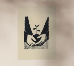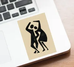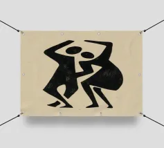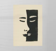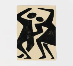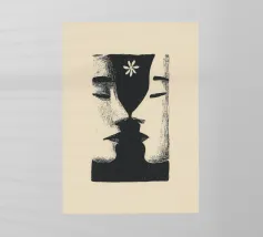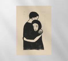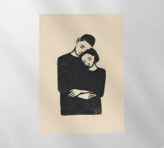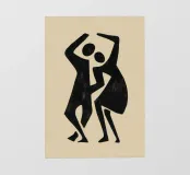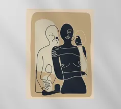 Due figure astratte disegnate in nero sono affiancate, collegate da una linea sottile. Minimalista e in netto contrasto su uno sfondo chiaro, la composizione trasmette vicinanza, equilibrio e una comunicazione silenziosa tra le forme.