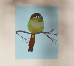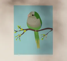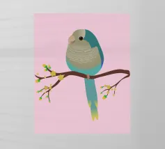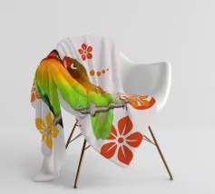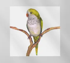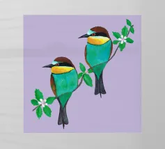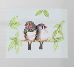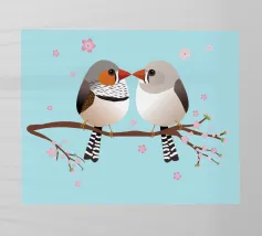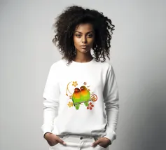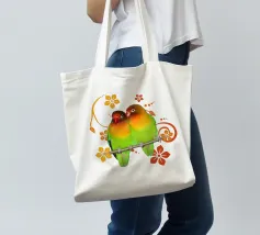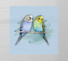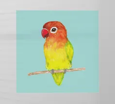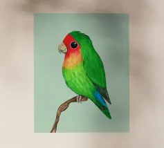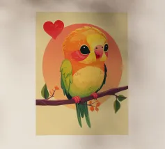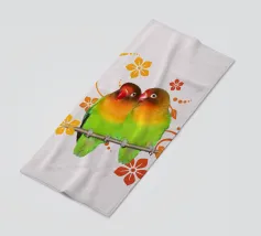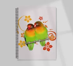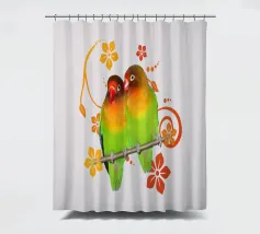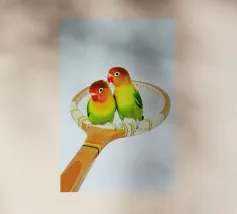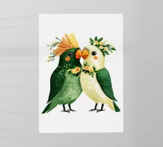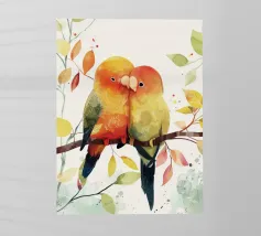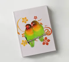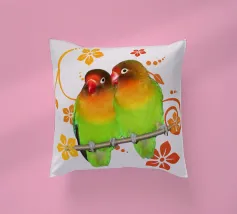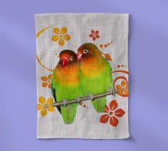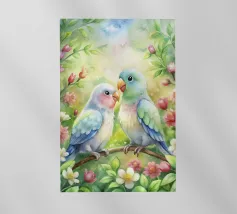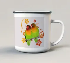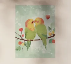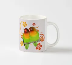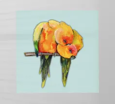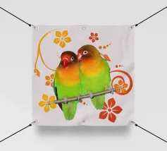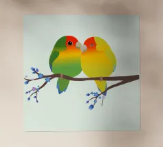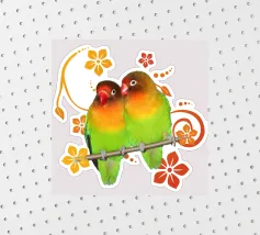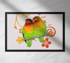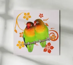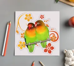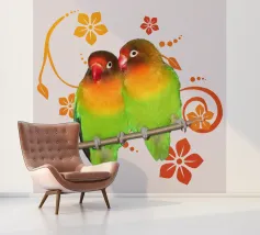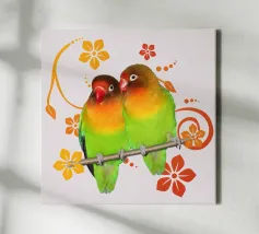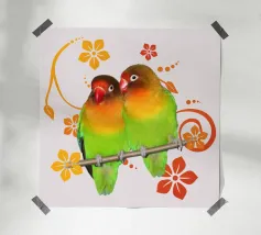 Un'immagine di due inseparabili della pesca appollaiati l'uno accanto all'altro. Elementi floreali aggiunti digitalmente. Sembrano molto rilassati e guardano l'osservatore.