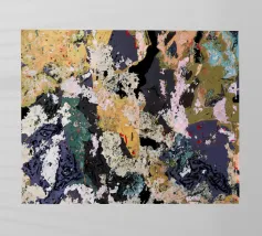 Bold swirls of blue and green intertwine with vibrant red and orange, creating a dynamic and energetic composition. Abstract forms and broad brushstrokes evoke a sense of motion and fluidity