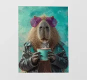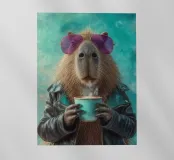 Elegante capibara in giacca di pelle con caffè mattutino pellicola backlit
