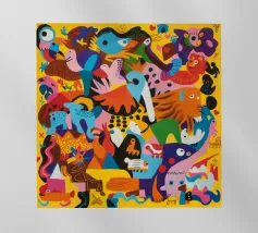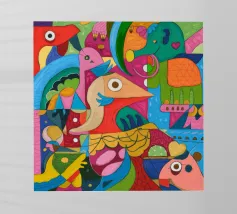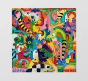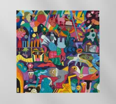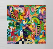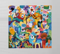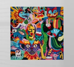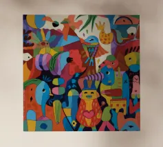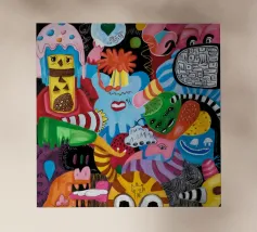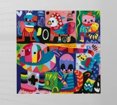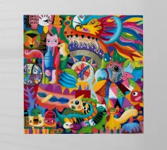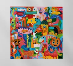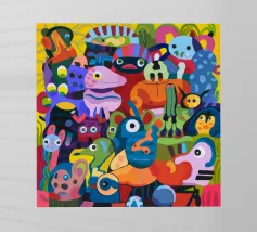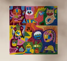 Un insieme di creature fantasiose raffigurate con tratti esagerati e motivi intricati. I colori e le texture dinamiche esaltano l'atmosfera giocosa.