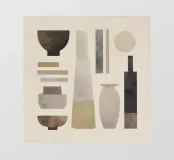 Illustrazione minimalista con vasi, ciotole e forme geometriche disposte in una composizione quadrata e pulita. Il beige naturale e le tonalità della terra la rendono una stampa versatile per interni moderni, scandinavi o boho.