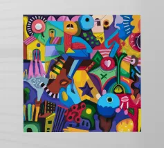 Questo dipinto è una composizione astratta audace e colorata con un mix di forme organiche e geometriche. L'uso di colori vivaci e forme dinamiche crea un senso di movimento ed energia.