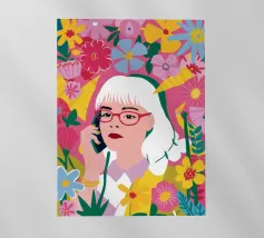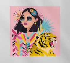 Questo dipinto raffigura una persona con i capelli neri che indossa un abito colorato con forme geometriche. Lo sfondo è rosso e la persona è adornata con grandi orecchini circolari.