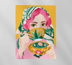 Questo dipinto raffigura una persona con un tatuaggio di una rosa sulla spalla. La persona indossa grandi orecchini d'oro e lo sfondo è di un rosso intenso, che sottolinea la natura audace ed espressiva dell'opera.