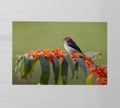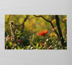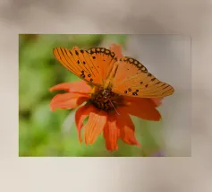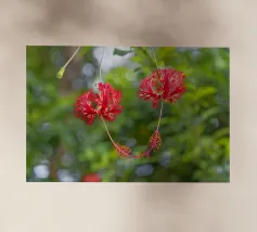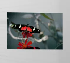 Due farfalle dalle ali delicate e maculate sono appollaiate su vivaci fiori rossi, circondati da un fogliame verde e rigoglioso. La scena cattura un momento di bellezza naturale e di tranquillità.