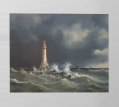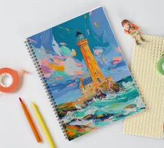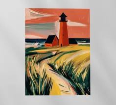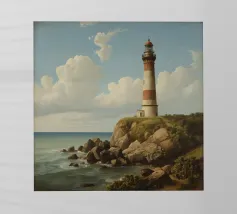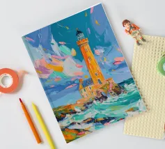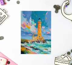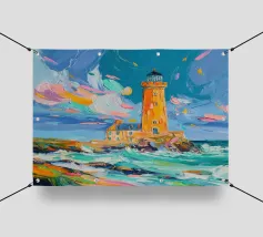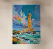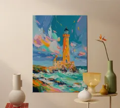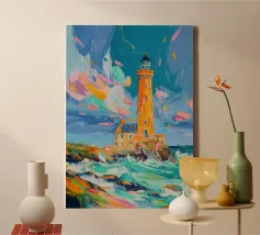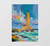 Pittura astratta a olio di un faro nello stile di Gustav Klimt: Toni arancioni e gialli, circondato da onde marine selvagge, cielo blu con nuvole colorate. Stile impressionistico, pennellate visibili, alta risoluzione e iperrealismo, che creano una scena vivace e colorata.