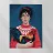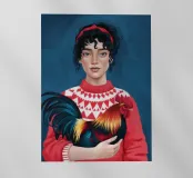 Questa opera d'arte mostra una persona con un maglione rosso che tiene in mano un gallo. Lo sfondo è scuro e mette in risalto gli elementi rustici e affascinanti della scena.