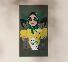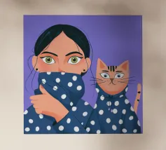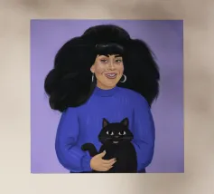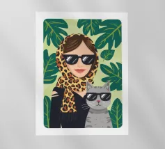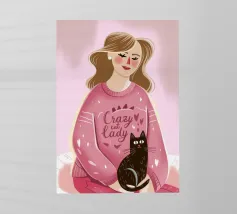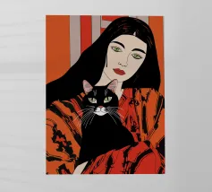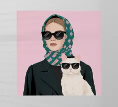 Ritratto chic e misterioso di una donna con felpa rosa acceso e occhiali da sole scuri, che tiene in mano un elegante gatto nero. I colori audaci e l'espressione fredda ed enigmatica creano una dichiarazione moderna ed elegante.