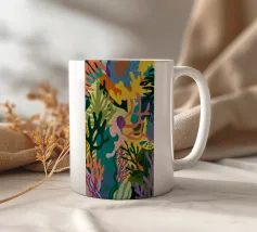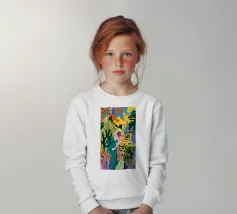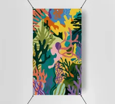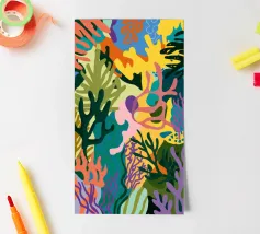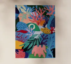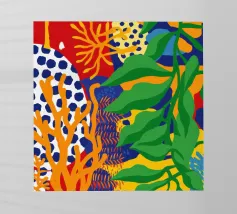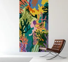 Una composizione astratta alta e stretta, piena di forme e motivi di foglie colorate sovrapposte, che suggerisce una fetta vibrante di una fitta giungla verticale.