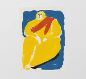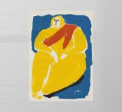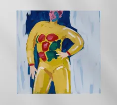 Una rappresentazione astratta e pittorica di una figura sdraiata in audaci ed espressivi tratti di giallo su uno sfondo blu scuro, che celebra la forma umana con grazia minimalista e colori vibranti.