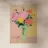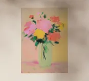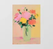 Un dipinto astratto mostra un vaso verde chiaro con fiori rosa, arancioni, gialli e verdi su uno sfondo rosa chiaro. Le diverse forme dei fiori e le pennellate visibili su uno sfondo giallo-arancio conferiscono all'opera consistenza, profondità e vividi contrasti di colore.
