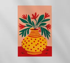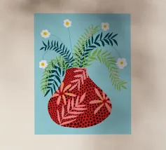 Ravvivate la vostra casa con questo moderno motivo floreale. Il vaso stilizzato in rosso e rosa, circondato da foglie blu e fiori delicati su uno sfondo azzurro, conferisce a questo disegno un aspetto grafico e contemporaneo. Ideale per decorazioni murali, cuscini, tazze, cover per cellulari e molto altro ancora. Questo motivo è perfetto per chi ama i disegni giocosi e colorati con un tocco di arte e modernità. Crea accenti vivaci e si adatta a un'ampia varietà di stili di interni.
