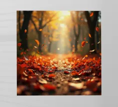 La luce dorata del sole filtra attraverso le vibranti foglie autunnali, creando un'atmosfera calda e serena in un ambiente naturale. I ricchi colori delle foglie esaltano la bellezza della scena.